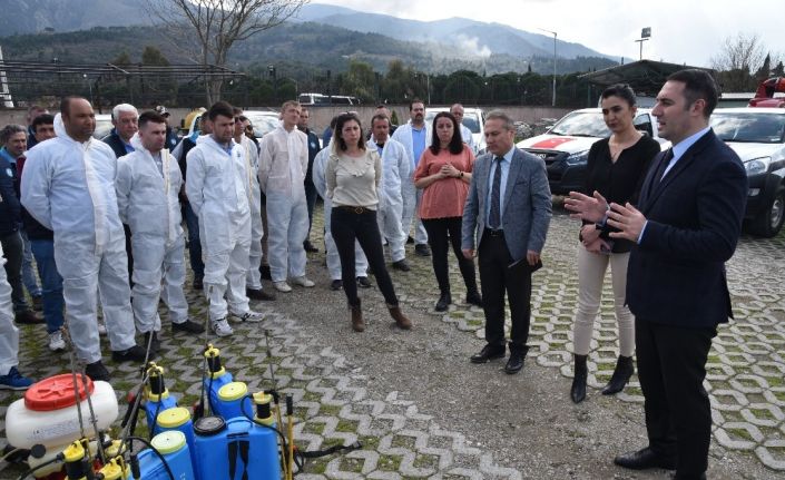Manisa Büyükşehir Belediyesi Sağlık İşleri Dairesi Başkanlığı, korona virüse (Covid-19) karşı Manisa genelinde ilaçlama çalışması yürütüyor. Dezenfeksiyon çalışmaları kapsamında toplum sağlığını etkileyebilecek olan cami, park ve bahçeler, okullar, sosyal alanlar, toplu taşıma araçları gibi toplumsal kullanım alanlarında 7/24 ilaçlama çalışmaları yapılıyor. Manisa Büyükşehir Belediyesi Genel Sekreter Yardımcısı Ertuğrul Yıldırım, Sağlık İşleri Daire Başkanı Uğur Başkal ve Haşere İle Mücadele Şube Müdürü Firuze Ak ile birlikte dezenfeksiyon uygulamalarını yapan haşere ile mücadele personeli ile bir araya geldi. Ülkemizde de geçtiğimiz gün itibariyle 1 vakanın tespit edildiğini dile getiren Genel Sekreter Yardımcısı Ertuğrul Yıldırım, "Ülkemiz gereken önlemleri almıştı. Biz de bu önlemelere ek olarak özellikle toplum sağlığını hızlı bir şekilde etkileyebilecek olan toplumsal kullanım alanlarında ilaçlama yapıyoruz. Bugün itibariyle elimizdeki işleri bırakıp dezenfeksiyon için gece gündüz çalışacağız. Dezenfeksiyon programı kapsamında 17 ilçede yapılan uygulamaları yakından takip edeceğim. İnşallah bu durumu bir an önce atlatıp hayatımıza kaldığımız yerden devam ederiz" dedi.