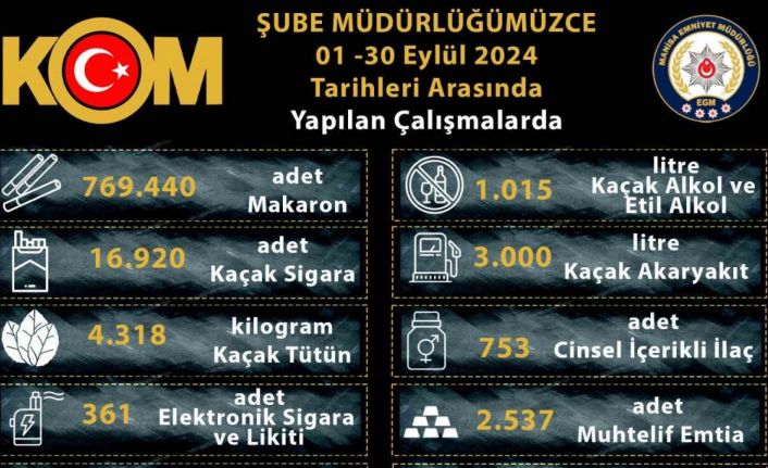 Operasyonlar kapsamında; 769 bin 440 adet makaron, 16 bin 920 adet kaçak sigara, 4 bin 318 kilogram kaçak tütün, 753 adet cinsel içerikli ürün, 2 bin 537 adet muhtelif emtia, 1 bin 15 litre kaçak alkol ve etil alkol, 361 adet elektronik sigara ve likiti, 3 adet tabanca, 91 adet mermi ve kartuş ele geçirildi.