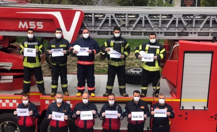 Manisa Büyükşehir Belediyesi İtfaiye Dairesi Başkanlığı personeli korona virüs tedbirleri kapsamında ellerindeki yazılarla Manisalılara çağrıda bulunarak vatandaşların evlerinde kalmasını istedi.
