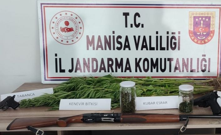 Salihli İlçe Jandarma Komutanlığı ekiplerince yapılan istihbarat çalışmaları sonucu B.Ö. isimli şahsın ikametinde kenevir bitkisi yetiştirildiği tespit edildi. Bunun üzerine harekete geçen jandarma ekipleri, ikamet ve eklentilerinde arama yaptı. Yapılan aramada 45 kök kenevir bitkisi, 30 gram kubar esrar, 1 adet tabanca, 1 adet kurusıkı tabanca ile 1 adet av tüfeği ele geçirildi. Olayla ilgili adli tahkikat başlatıldığı bildirildi.