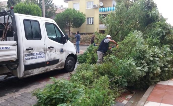 Manisa’da etkili olan fırtına bazı ağaçların devrilmesine neden oldu. Yunusemre Belediyesi de kenti etkisi altına alan fırtına dolayısıyla teyakkuza geçti. Fırtına nedeniyle zarar gören ağaçlar belediye ekiplerince kaldırılırken; ilçede vatandaşların herhangi bir sıkıntı yaşamaması için çalışmalar sürdürülüyor.