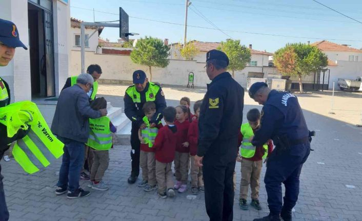 Manisa İl Jandarma Komutanlığı tarafından havanın karardığı saatlerde okuldan çıkan öğrencilerin hem görünürlüğünü arttırmak hem de yaşanabilecek kazaların önüne geçmek amacıyla reflektif özellikli yelek dağıtıldı.
