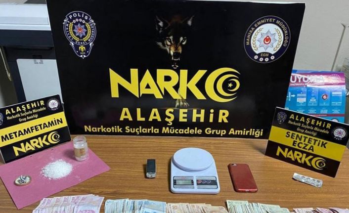 Alaşehir İlçe Emniyet Müdürlüğü Narkotik Suçlarla Mücadele Grup Amirliği görevlileri tarafından uyuşturucu madde satan, kullanan ve nakleden şahıslara yönelik yapılan saha araştırmaları ve çalışmalarında uyuşturucu madde satın aldığı tespit edilen S.Ö. (47) isimli şahsın iş yerinde yapılan aramada cam kavanoz içerinde 145.33 gram metamfetamin, 2 adet hassas terazi, 1 adet sentetik ecza hapı ve 12 bin 835 TL nakit para ele geçirildi.