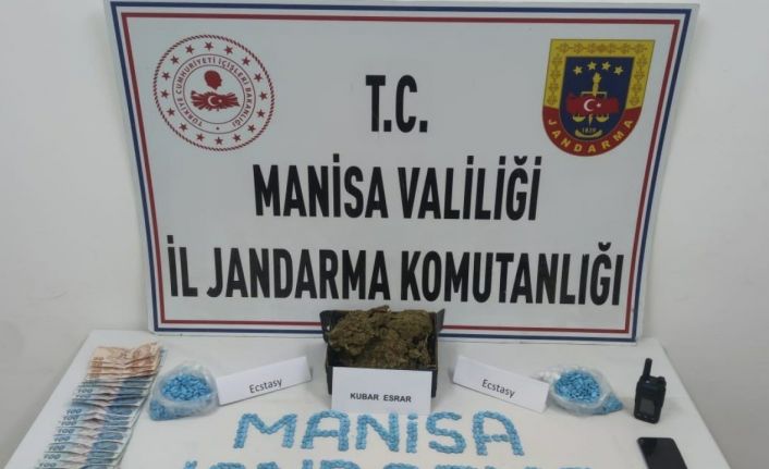 Manisa İl Jandarma Komutanlığı ile Yunusemre ilçe Jandarma Komutanlığı ekipleri, yürüttükleri istihbarat çalışmaları sonucu dün gece saatlerinde Manisa-İzmir yolu Sabuncubeli mevkiinde bir otomobile operasyon düzenledi. Otomobilde yapılan aramada; 2 bin adet ecstasy hap, 605 gram kubar esrar, 4 bin TL, 1 adet el telsizi, 2 adet cep telefonu ele geçirilirken, şüpheli Ü.P. (26) gözaltına alındı.