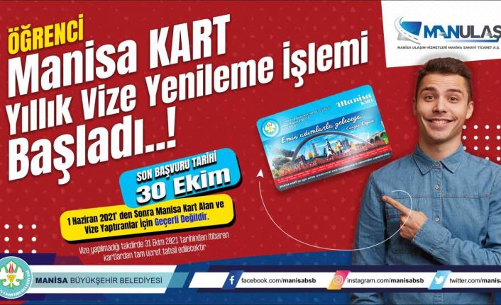 1 Haziran 2020-1 Haziran 2021 tarihleri arasında ve öncesinde Manisakart’ını alan ve toplu taşıma araçlarının indiriminden faydalanan öğrenciler için yıllık vize yenilemesi başladı. Manisa Büyükşehir Belediyesinden yapılan duyuruda, öğrencilerin toplu ulaşım araçlarından indirimli yararlanabilmesi için vize işlemini 30 Ekim tarihine kadar yaptırmaları gerektiği belirtildi.
