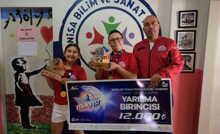 Manisa Bilim ve Sanat Merkezi öğrencileri Taha Arben Vurgun, Ayşe Nehir Nalbantoğlu, Yusuf Elmas Proje Danışman öğretmeni Sözer Vurgun öncülüğünde hazırladıkları “Erişilebilir Zeka Oyunları” projesiyle TEKNOFEST 2022 Samsun’dan birincilik ödülü, Trabzon’dan da “En iyi sunum” ödüllerini aldı. 81 il 107 ülke 154 bin 834 takım 600 bin yarışmacı 27 bin 715 finalist ve “Engelsiz Yaşam Teknolojileri” alanında 11 bin 309 proje arasından birinci olan öğrenciler ödüllerini Cumhurbaşkanı Recep Tayyip Erdoğan’ın elinden aldı. Engelli bireylerle tüm diğer çocukların birlikte vakit geçirip eğitim göreceği materyaller hazırlayan öğrenciler, aldıkları ödüllerle mutluluk yaşadıklarını söyledi.
