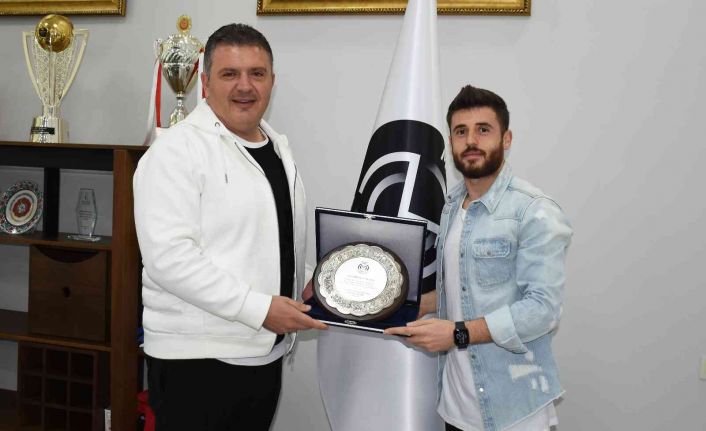 Manisa Futbol Kulübü Başkanı Mevlüt Aktan, takımdan ayrılan başarılı futbolcu Mehmet Yılmaz’a plaket verdi.