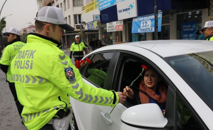 Akhisar İlçe Emniyet Müdürlüğü Trafik Denetleme Şube Müdürlüğü ekipleri, 8 Mart Dünya Kadınlar Günü dolayısıyla trafikte durdurdukları kadın sürücülere çiçek verdi.