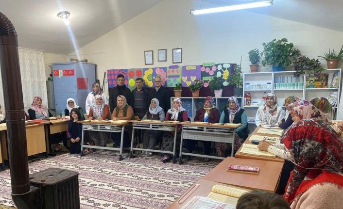 Köy Yaşam Merkezinde devam eden kursu ziyaret eden İlçe Milli Eğitim Şube Müdürü Mehmet Yavuz ve İlçe Müftülük Şube Müdürü Yaşar Güç, kursa katılan kadınlarla ve mahalleli ile değerlendirmede bulundu.