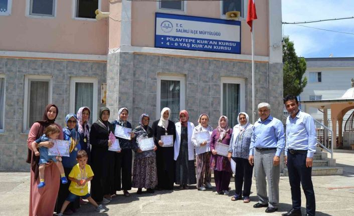 Manisa’nın Salihli ilçesindeki Pilavtepe Camisinde düzenlenen Kur’an kursuna katılan kursiyerlere düzenlenen törenle katılım belgeleri takdim edildi.