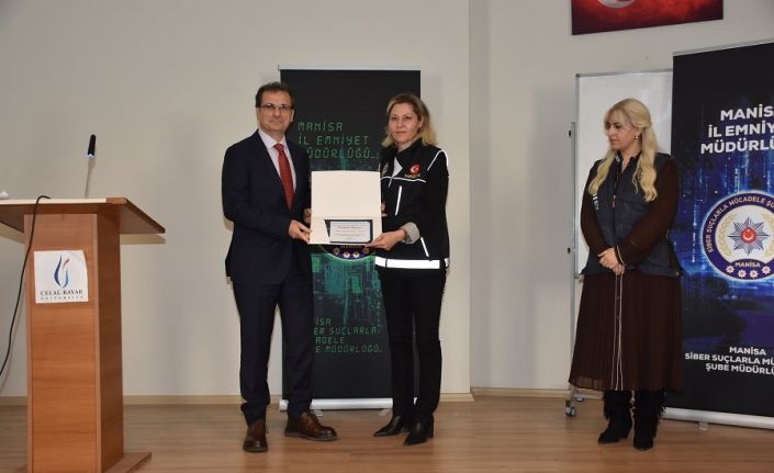 Manisa’nın Salihli ilçesinde üniversite öğrencilerine yönelik düzenlenen seminerde siber suçlar, internet dolandırıcılığı ve kişisel veri güvenliği konuları ele alındı.