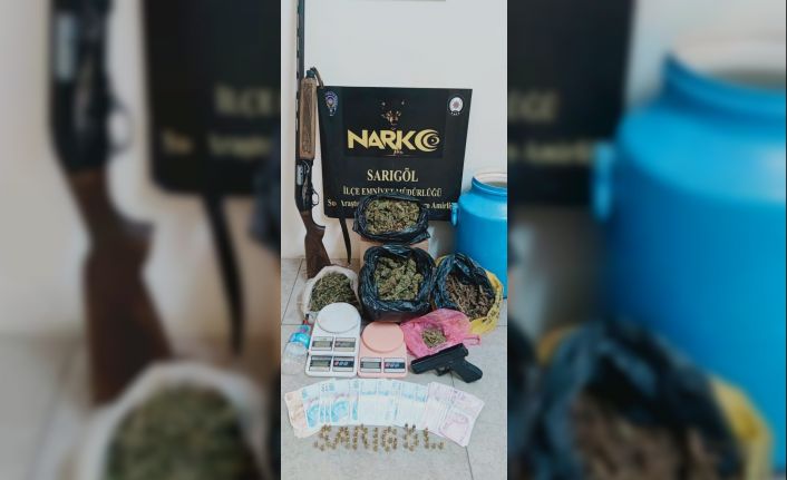 Manisa İl Emniyet Müdürlüğü Narkotik Suçlarla Mücadele Şubesi ve Sarıgöl İlçe Emniyet Müdürlüğü görevlilerince uyuşturucu veya uyarıcı madde ticareti yapan, nakleden ve kullanan şahıslara yönelik yapılan çalışmalar çerçevesinde Sarıgöl ilçesinde bir bağ evi ve iş yerine operasyon düzenlendi. Her iki ikamette yapılan aramada; 1 kilo 659 gram esrar maddesi, 1 adet 9 mm ruhsatsız tabanca, 53 adet fişek, 1 adet ruhsatsız av tüfeği, 3 adet hassas terazi, 1 adet uyuşturucu madde kullanmaya yarayan aparat ele geçirildi. Operasyonda D.K. (58) isimli şüpheli şahıs “Uyuşturucu veya uyarıcı madde imal ve ticareti yapmak” suçundan gözaltına alındı. Adliyeye sevk edilen D.K. tutuklanarak cezaevine gönderildi.