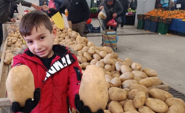 Dev patatesler, çocukların da ilgisini çekti. Anne ve babasından izin alarak tezgaha yaklaşan küçük Yağız Sarıkaya, iki dev patatesi eline alarak fotoğraf çektirmeyi ihmal etmedi.