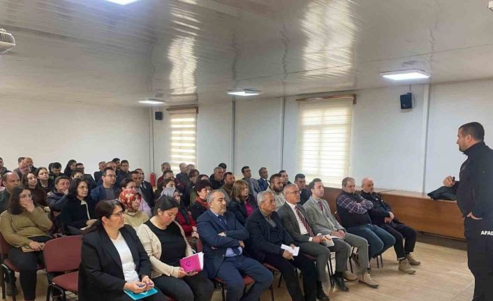 Sarıgöl’de gerçekleştirilen Afet ve Acil Durum Müdahale Planın eğitiminde afet öncesi, afet sırasında ve afet sonunda alınması gereken bilgiler aktarıldı.