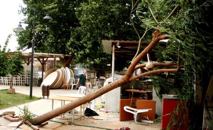 Manisa’nın Sarıgöl ilçesinde dün akşam saatlerinde etkili olan şiddetli fırtına çiftçileri endişelendirirken ilçede bazı işyerlerinin levhaları düştü, bir servi ağacı da kökünden söküldü.