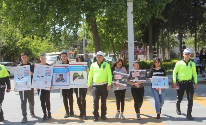 Karayolları Trafik Haftası etkinlikleri çerçevesinde Manisa’nın Sarıgöl ilçesinde emniyet ve jandarma ekipleri tarafından ilçede sürücülere broşür dağıtılırken yayalara uygulamalı eğitim ve bilgilendirmede bulunuldu.