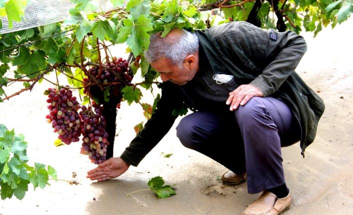 Manisa’nın Sarıgöl ilçesinde dün akşam saatlerinde etkili olan şiddetli yağmur ve dolu nedeniyle sergide kurutulmaya bırakılan üzümlerde zarara neden oldu.