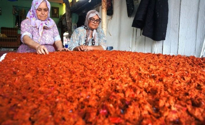 Manisa’nın Sarıgöl ilçesinde kadınlar tarafından pazardan satın alınan biberlerle evlerde tarhana yapımına başlandı.