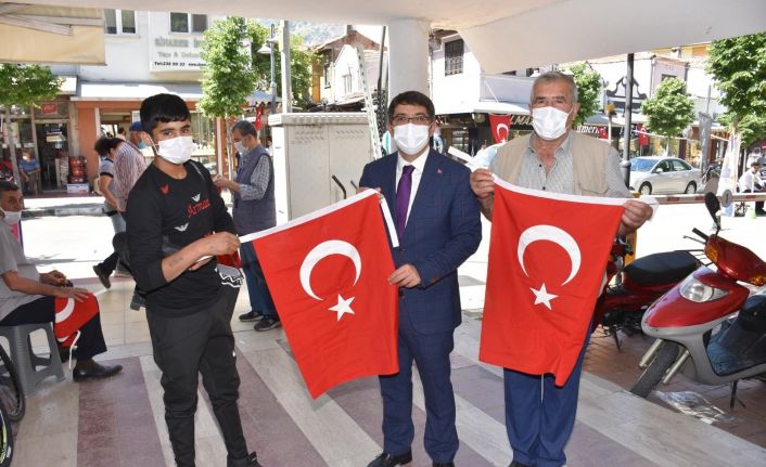Başkan Çelik belediye girişinde de iş ve işlemleri için belediyeye gelen vatandaşlara Türk Bayrağı dağıtarak bayramlarını kutladı.