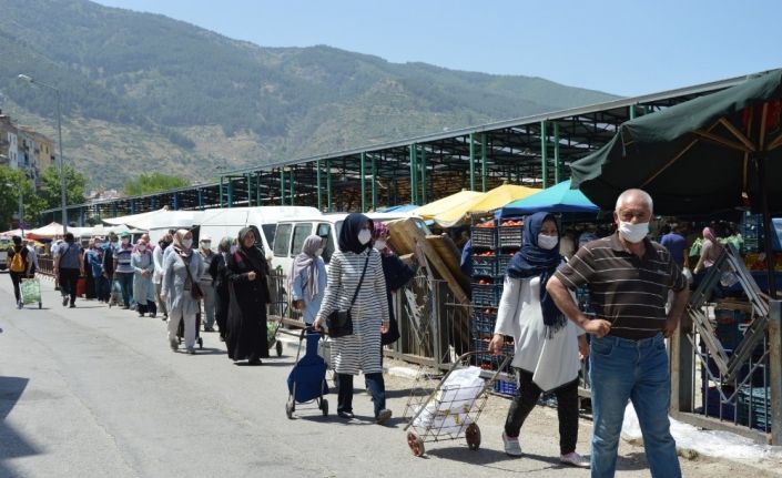 Ramazan Bayramına sayılı günler kala Manisalılar 4 gün uygulanacak olan sokağa çıkma kısıtlamasında sıcak havaya rağmen Perşembe Pazarına akın etti. Sosyal mesafe kurallarına uygun bir şekilde uzun kuyrukların oluştuğu pazar girişinde vatandaşlar içeri tek tek alındı.