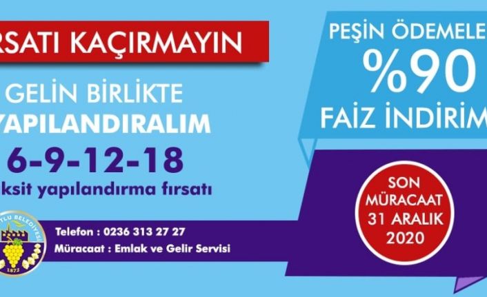 Resmi Gazete’de yayımlanan ‘Bazı Alacakların Yeniden Yapılandırılması ile Bazı Kanunlarda Değişiklik Yapılması Hakkındaki Kanun’una göre Emlak ve Çevre Temizlik Vergi borçları da yapılandırma kapsamına alındı. Turgutlu Belediyesi de sunduğu hizmetle vergi borçlarını yapılandırıyor. Vergi borçlarını yapılandırmak isteyen Turgutlulular, peşin ödemelerde yüzde 90 faiz indiriminin yanı sıra 6, 9, 12 ve 18 taksitte yapılandırma fırsatından yararlanabilecek.