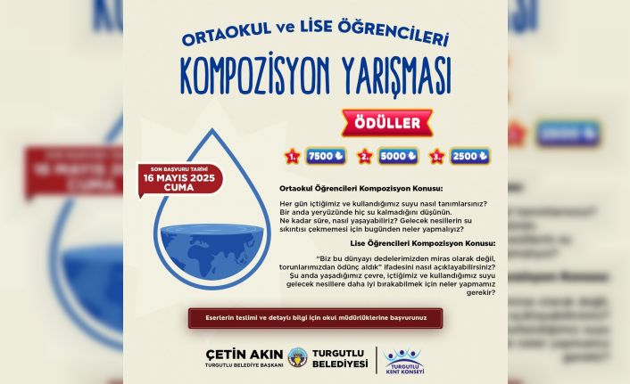 Turgutlu Belediyesi ve Turgutlu Kent Konseyi işbirliğinde lise ve ortaokul öğrencilerine yönelik ödüllü kompozisyon yarışması düzenlenecek. Öğrenciler, eserlerini 16 Mayıs 2025 Cuma gününe kadar okul müdürlerine teslim edebilecek.