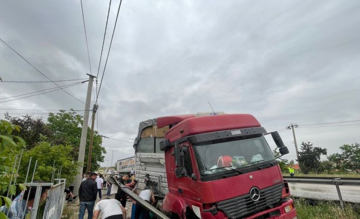Manisa’nın Kula ilçesinde yağmurda kayganlaşan yolda kontrolden çıkan tır, bariyerlere çarptıktan sonra yan yola devrildi. Kazada sürücü yara almazken, araçta hasar meydana geldi.