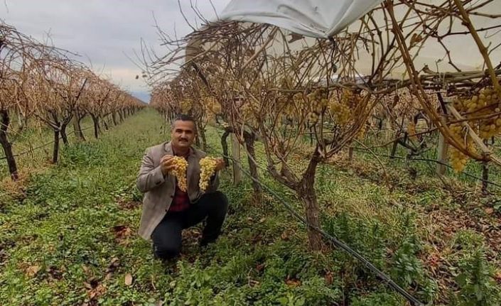 Yaz meyvesi olan üzümler Aralık ayının bitmesine sayılı günler kala örtü altında hala dallarında tazeliğini korumaya devam ediyor. Örtü altında bekletilen üzümler yılbaşı sofralarını hem tat hem renk katacak.