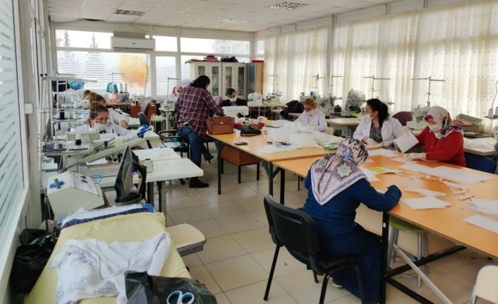 Mardin’in Artuklu İlçe Kaymakamlığı bünyesinde bulunan Halk Eğitim Merkezi Müdürlüğünde, 14 gönüllü kadın tarafından günlük 500 adet maske üretiliyor.