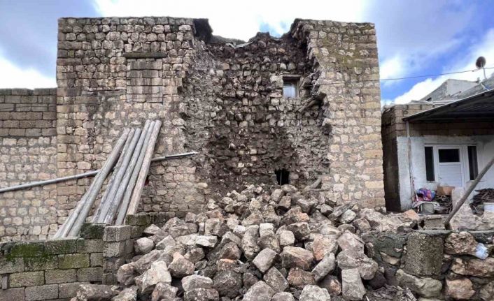 Mardin’de, Kahramanmaraş merkezli depremlerde ağır hasar alan eski ev, şiddetli yağışta yıkıldı.