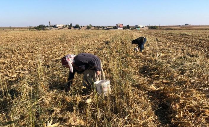 Mardin’in Kızıltepe ilçesinde ikinci ürün olan mısırın hasadından sonra boş kalan mısır koçanını kadınlar, kışlık yakacak ve tandırda yakmak için topluyor.