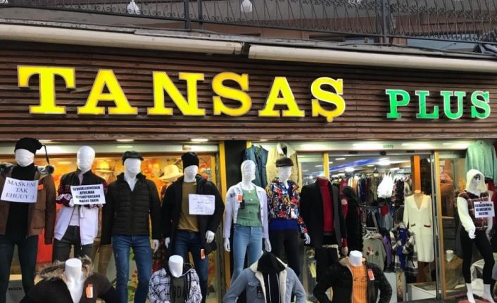 Mardin’de hizmet veren Tansaş Giyim Mağazaları, korona virüse dikkat çekmek için cansız mankenlere maske takıp, maskesiz gezen vatandaşlara maske dağıttı. Mağaza yönetimi, cansız mankenlerin üzerine de maske takmayı özendirici yazılar astı.