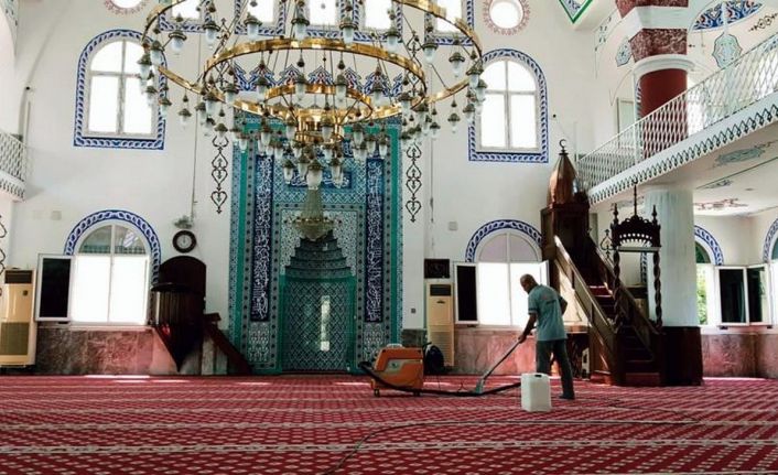 Mersin’in merkez Akdeniz ilçesi sınırlarında bulunan camiler temizlenip halıları yıkanıyor, bitmek üzere olan korona virüs salgınına rağmen ilaçlama devam ediyor.