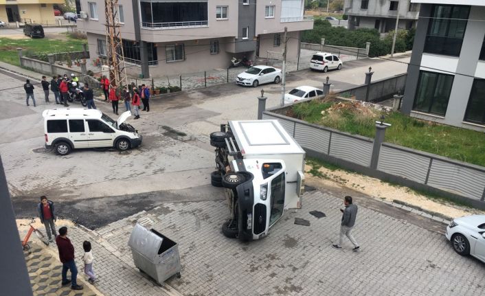 Mersin’in Erdemli ilçesinde hafif ticari araçla çarpışan kamyonet devrildi, sürücüler yara almadan kurtuldu.