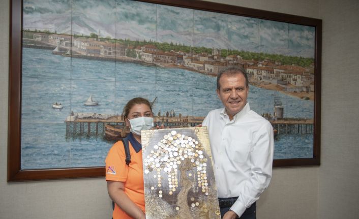 Mersin’de temizlik çalışmaları sırasında bulduğu atıkları sanat eserine dönüştüren belediye temizlik görevlisi kadın, bozuk paralardan yaptığı tabloyu Büyükşehir Belediye Başkanı Vahap Seçer’e hediye etti.