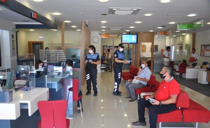 Mersin’de banka personelleri ve müşteriler, korona virüs salgınına karşı sosyal mesafe ve maske kullanımı konusunda uyarıldı.