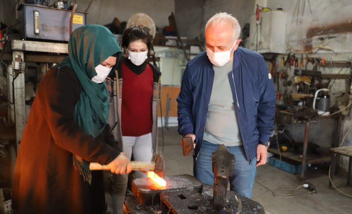 Akdeniz Belediye Başkanı Mustafa Gültak, mikro kredi desteği alan ödüllü demirci ustası kadını atölyesinde ziyaret etti.