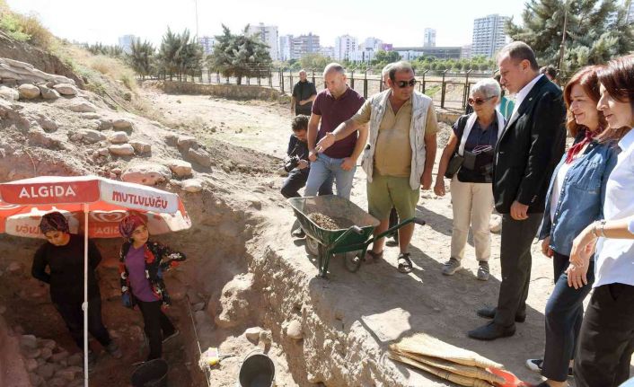 Kazı çalışmalarının sürdüğü höyükte Kazı Başkanı Prof. Dr. Isabella Caneva ve kazı ekibi, Başkan Seçer’e Yumuktepe’nin 9 bin yıllık tarihine ilişkin bilgiler verdi.