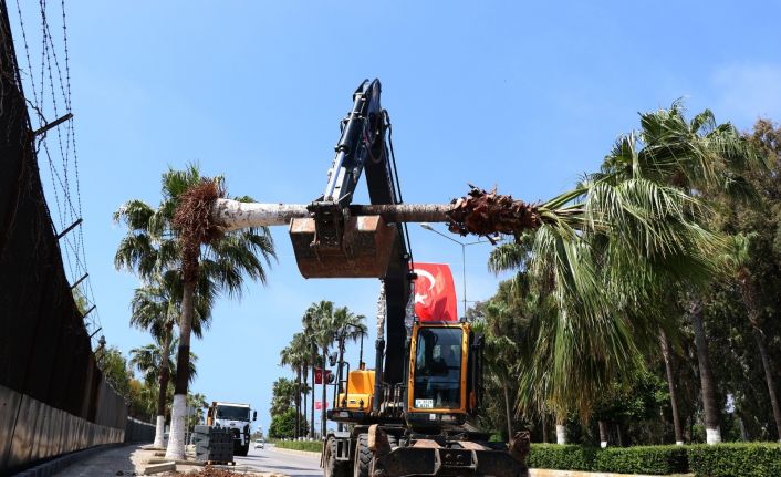 Mersin Büyükşehir Belediyesi Park ve Bahçeler Dairesi ekipleri, bisiklet yolu proje alanında kalan palmiye ağaçlarını yeni yerlerine taşıyor. Alandan sökülen 17 palmiye ağacı 36. ve 34. caddede uygun alanlara dikiliyor.