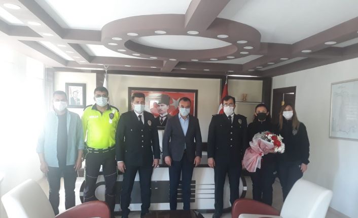 Ziyarette, bayan polis memuru Nilgün Bahar, Kaymakam Yılmaz’a çiçek verdi.