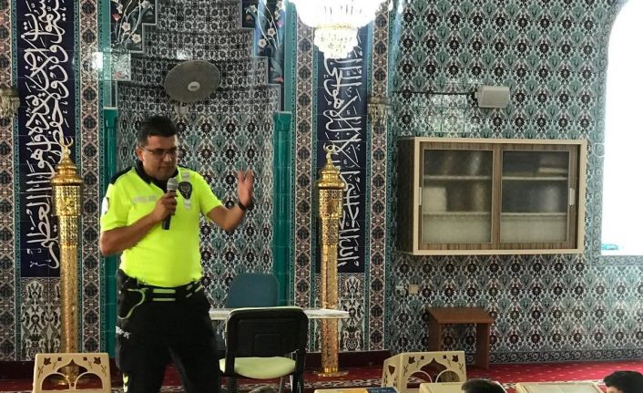 Mersin’in Bozyazı ilçesinde düzenlenen Yaz Kur’an Kurslarına devam eden öğrencilere, İlçe Emniyet Müdürlüğü Trafik Denetleme Büro Amirliği tarafından trafik eğitimi verildi.