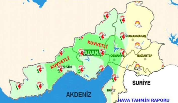 Meteoroloji 6. Bölge Müdürlüğünden yapılan açıklamada, bugün öğle saatlerinden itibaren Adana’nın kuzey ve doğusunda Yumurtalık, Ceyhan, Sarıçam, Pozantı, Kozan, Karaisalı, İmamoğlu, Çukurova ve Aladağ ilçeleri ile Mersin’in kuzeyinde Mut, Silifke, Erdemli, Mezitli, Toroslar, Çamlıyayla ve Tarsus ilçeleri, Osmaniye ve Hatay’ın kuzey ilçeleri Dörtyol, Payas, İskenderun ve Erzin ile Kahramanmaraş’ın Andırın ilçesinde yerel olarak kuvvetli gök gürültülü sağanak yağış beklendiğin ifade edildi.