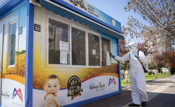 Mersin Büyükşehir Belediyesi, kentin 38 noktasında yer alan MER-EK Halk Ekmek Fabrikası büfelerini, korona virüs salgınına karşı düzenli olarak dezenfekte ediyor.
