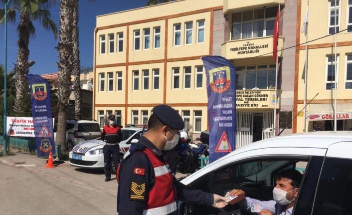 Tarsus Jandarma ekipleri, ilçenin çeşitli noktalarında yaptıkları trafik uygulamalarında sürücülere maske, dezenfektan ve broşür dağıtarak sürücüler üzerinde farkındalık oluşturulmasını sağladılar.