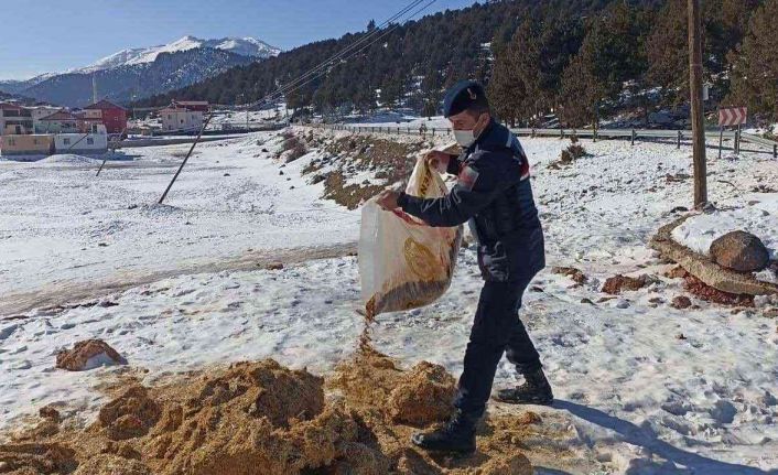 Mersin’de jandarma ekipleri, yaban hayvanların aç kalmaması için doğaya mama ve saman bıraktı.