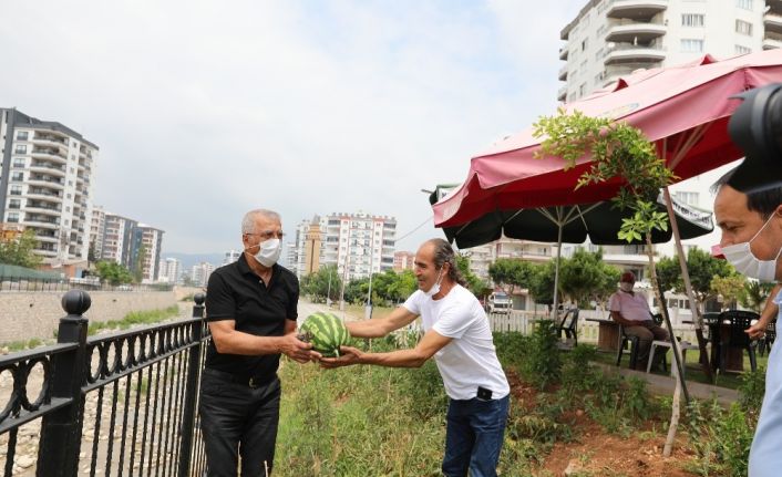 Mezitli’nin güzellikler kenti olduğunu ifade eden Tarhan, “Sürekli olarak burada ders çalışan öğrencilerin başarılarıyla mutlu olduğumuz Fitnat Gürsoy Kafe Kütüphanemize bugün çok farklı bir olay için geldik. Gönüllü olarak kütüphanemizi işleten Onur Baysal, korona virüs nedeniyle kapalı olduğu dönemde bahçeye sebze ekti. Toplamak için de bizleri ve değerli muhtarlarımızı davet etti. Farklı ve unutulmaz bir gün yaşadık. Muhtarlarımızla birlikte ders çalışan öğrencilerimize karpuz ikram ettik” dedi.