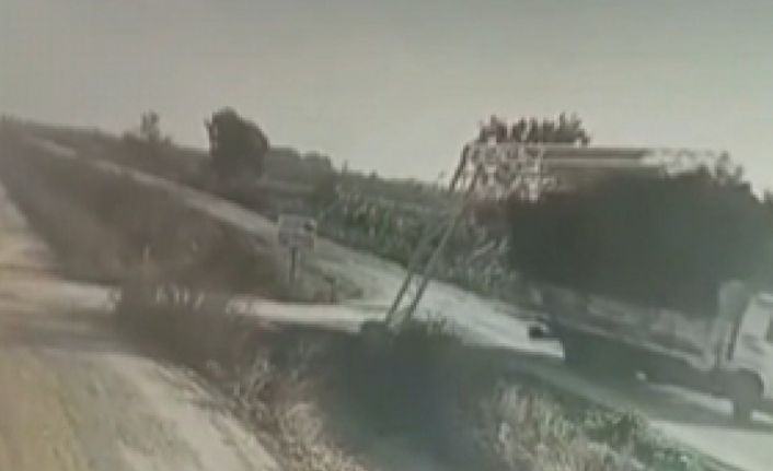 Olay ilçeye bağlı Kefeli Mahallesi’nde meydana geldi. Plakası alınamayan odun yüklü kamyon mahalle girişinde bulunan 2 ayaklı tak tabelasına takıldı. Takı yerinde söken kamyon üzerinde ’Kefeli Mahallesi’ yazılı tabelayla köprü üzerinde geçip karşı yöne giderken, sürücü tabelayı fark etti. Köprüyü geçtikten sonra hafif geri yapan kamyon sürücüsü takı karşı yöne bırakarak yoluna devam ederek, köy yolunu değiştirdi. Olay anı mahalle girişinde bulunan güvenlik kamerasına anbean yansıdı.