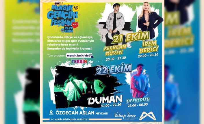 Bu etkinliklerden biri olan Gençlik Festivali çerçevesinde önemli sanatçıları Mersin’de gençlerle buluşturacaklarını sözlerine ekleyen Taşkın, “Bu sanatçılardan gençler tarafından çok beğenilen İrem Derici 21 Ekim’de, Duman grubu da 22 Ekim’de sahne alacak. Ayrıca sportif etkinlikler var. Gençlere yönelik dijital spor oyunları var. Festivalimiz içerisinde mini söyleşiler de yer alacak. Kısacası dolu dolu bir festival olacak. Bütün gençleri, özellikle üniversite gençliğini bu festivale bekliyoruz” diye konuştu.