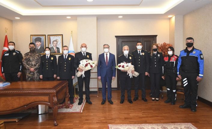 Mersin İl Emniyet Müdürü Mehmet Şahne ile Mersin Şehit Altuğ Verdi Polis Meslek Eğitim Merkezi Müdür Vekili Zafer Ağırkaya, beraberinde müdür yardımcıları ve şube müdürleriyle birlikte Türk Polis Teşkilatının kuruluşunun 176. yıldönümü dolayısıyla Vali Ali İhsan Su’yu ziyaret etti.