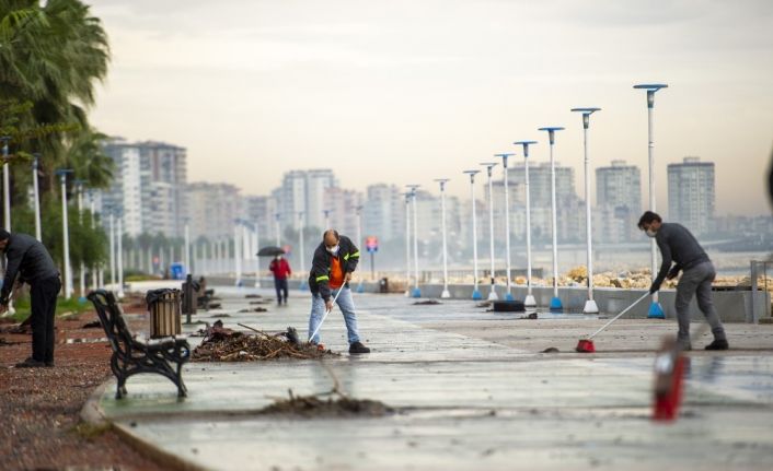 Meteoroloji Genel Müdürlüğü’nün uyarıları çerçevesinde yoğun yağış boyunca teyakkuzda olan Büyükşehir ve MESKİ ekipleri, gelen tüm ihbarları değerlendirerek ızgara, kanal temizliği, yağmursuyu şebeke çalışmaları yaparak vatandaşların evleri ve iş yerleriyle araç trafiğini etkileyecek yağmursuyu birikintilerinin yaşanmaması için çalışmalar yürüttü. Büyükşehir Belediyesi Adnan Menderes Bulvarı boyunca Atatürk Parkı, Hilton-Mezitli deresi arasına kadar olan alanda kapsamlı bir temizlik çalışması gerçekleştirdi. Park ve Bahçeler Dairesi ekipleri fırtınanın sahilin karo taşlarına verdiği zayiatı giderirken, sağlam olan taşları ise yeniden düzenlemek için ayırdı. Deniz taşması sonucu denizden gelen çamur, birikinti ve çeşitli atıklar da temizlendi.